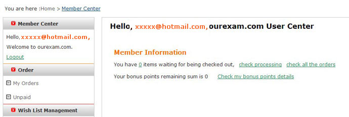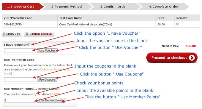 5. In this page, please confirm the exam name and code carefully. You can type the voucher code ,promotion code or use your memember points and click the button which showed for each blank ,Then, you should click the button "Proceed to checkout" into the next page.